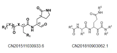 其中中國科學院上海藥物研究所于2015年與德國呂貝克大學生物化學學院合作申請的專利CN201511030933.6公開的化合物結(jié)構(gòu)如下圖7所示,雖然重點在于腸道病毒蛋白酶抑制劑,但在專利中公開了對冠狀病毒(SARS)主蛋白酶具有抑制活性;與復旦大學合作申請的專利CN201810903062.1公開的化合物應(yīng)用領(lǐng)域用于治療或預防與冠狀病毒相關(guān)的疾病或者與埃博拉病毒相關(guān)的疾病。