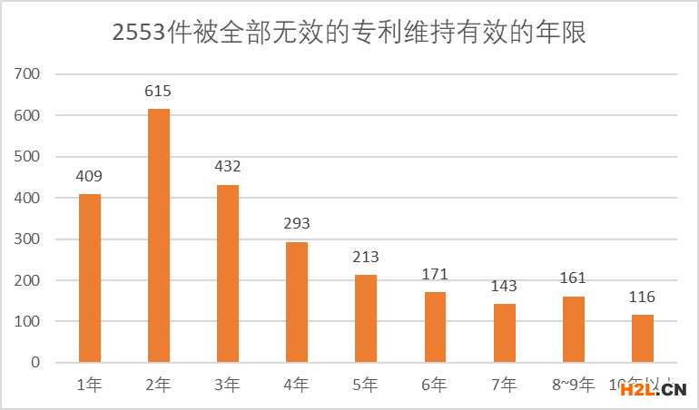 在2553件被宣告全部無(wú)效的專利中,專利權(quán)的維持年限(“授權(quán)公告日”至“無(wú)效決定發(fā)文日”)以2年的最多,其次為3年和1年的,維持年限較長(zhǎng)的專利較少。