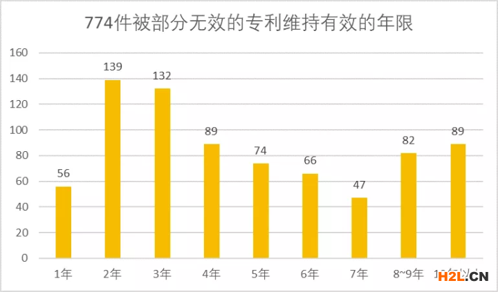 在774件被宣告部分無(wú)效的專利中,專利權(quán)的維持年限以2年的最多,3年和4年的次之。與被宣告全部無(wú)效的專利相比,部分無(wú)效的專利維持年限較長(zhǎng)的占比要多些。