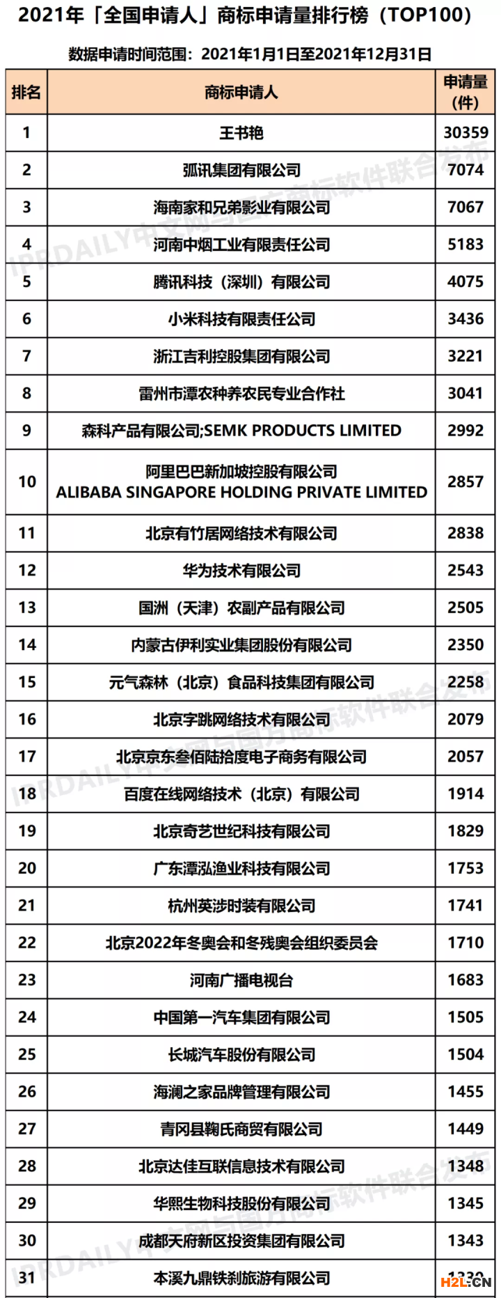 2021年全年商標(biāo)申請(qǐng)量前三的「全國(guó)申請(qǐng)人」分別為:王書(shū)艷(30359件)、弧訊集團(tuán)有限公司(7074件)、海南家和兄弟影業(yè)有限公司(7067件),該統(tǒng)計(jì)數(shù)據(jù)不包含已提交申請(qǐng)但未在商標(biāo)局官網(wǎng)公布的商標(biāo)數(shù)據(jù)。