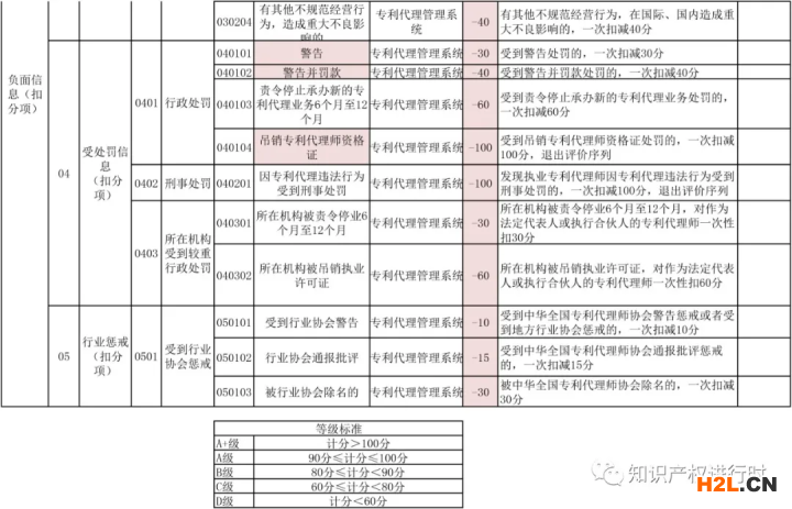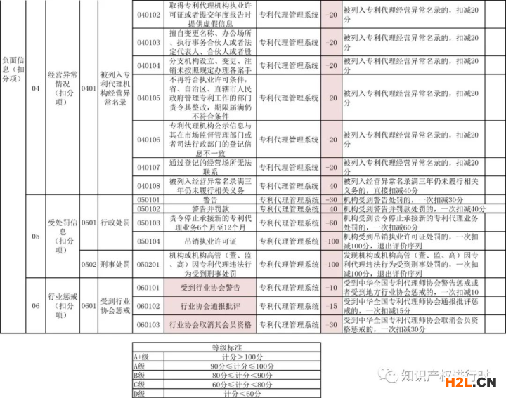 第五條 專利代理機構(gòu)和專利代理師信用等級按照從高到低順序分為四級,分別為“A”、“B”、“C”、“D”級,按計分情況評價。計分滿分為100分,根據(jù)負面信息予以扣減。負面信息包括不規(guī)范經(jīng)營或執(zhí)業(yè)行為、機構(gòu)經(jīng)營異常情況、受行政或刑事處罰、行業(yè)懲戒等情況。等級標(biāo)準(zhǔn)如下: