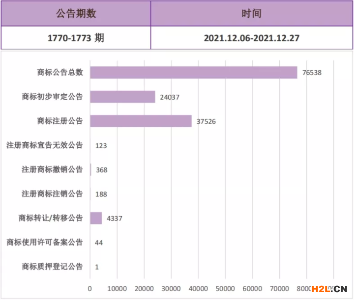第1770-1773期第03類商品上的商標(biāo)公告總數(shù)為a76538條,其中,商標(biāo)初步審定公告24037條,商標(biāo)注冊(cè)公告37526條,注冊(cè)商標(biāo)宣告無(wú)效公告123條,商標(biāo)轉(zhuǎn)讓/轉(zhuǎn)移公告4337條。