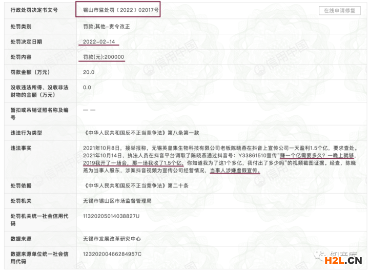 2021年10月8日,無錫市錫山區(qū)市場(chǎng)監(jiān)管局接舉報(bào)稱,無錫英皇集公司老板陳某在抖音上宣傳公司一天盈利1.5個(gè)億,要求查處。
