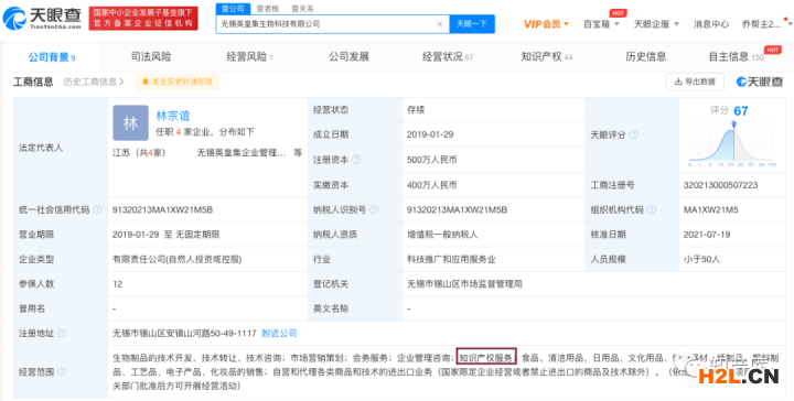 根據(jù)天眼查顯示,無錫英皇集公司的經(jīng)營范圍主要是生物制品的技術(shù)開發(fā)、市場(chǎng)營銷策劃、銷售食品及化妝品等,意外的是,居然有“知識(shí)產(chǎn)權(quán)服務(wù)”!