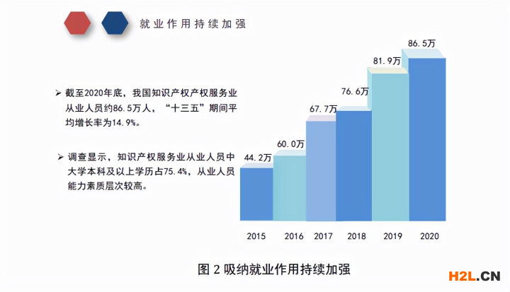 吸納就業(yè)方面作用明顯。據(jù)測算,截至2020年底,我國知識產(chǎn)權(quán)服務業(yè)從業(yè)人員約86.5萬人,較2019年底增長5.6%。調(diào)查顯示,7.3萬家知識產(chǎn)權(quán)服務機構(gòu)約吸納0.6萬失業(yè)再就業(yè)人員。在預期招錄人員方面,有45.7%的知識產(chǎn)權(quán)服務機構(gòu)2021預期招錄人員數(shù)量高于2020年(40.9%),約高于上一年度五個百分點。