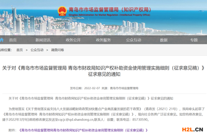 原標(biāo)題:關(guān)于對(duì)《青島市市場(chǎng)監(jiān)督管理局 青島市財(cái)政局知識(shí)產(chǎn)權(quán)補(bǔ)助資金使用管理實(shí)施細(xì)則(征求意見(jiàn)稿)》征求意見(jiàn)的通知