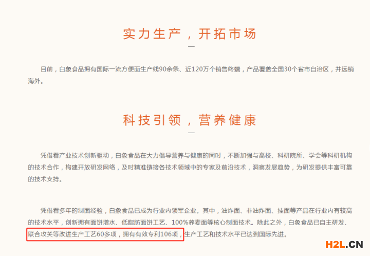 ?據(jù)中國商標(biāo)網(wǎng)數(shù)據(jù),白象已提交一千余件商標(biāo)申請,覆蓋了多個品類的產(chǎn)品。同時,來自白象官網(wǎng)的數(shù)據(jù)顯示,白象食品已有自主研發(fā)、聯(lián)合攻關(guān)等改進生產(chǎn)工藝60多項,擁有有效專利106項,生產(chǎn)工藝和技術(shù)水平已達到國際先進水平。圍繞著“一碗好面”這個主軸線,白象聚焦原料與工藝,以健康制面、極致口感為要求,堅持研發(fā)自然高品質(zhì)好面。