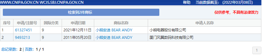 應(yīng)該不是這樣。小熊電器在申請“小熊尼奧NEOBEAR”商標(biāo)的同日,還申請了“小熊安迪 BEAR ANDY”、“小熊努比 NOOPY BEAR”、“小熊有約 BEARabout”、“小熊發(fā)現(xiàn) BEAR DISCOVERY”、“小熊貝比 BABY BEAR”等多件商標(biāo),商標(biāo)組成形式均與“小熊尼奧 NEOBEAR”商標(biāo)一樣為中英文組合且在“小熊”后面加詞,而且這些商標(biāo)在多年前即已被他人申請注冊,有的現(xiàn)在還在商標(biāo)售賣網(wǎng)站掛牌出售,例如第9類“小熊安迪 BEAR ANDY”商標(biāo)2012年被他人注冊,第10類“小熊努比 NOOPY BEAR”商標(biāo)2012年被他人申請、第19類“小熊有約 BEARabout”商標(biāo)2019年被他人注冊且掛牌價(jià)2.31萬,第25類“小熊發(fā)現(xiàn) BEARDISCOVERY”商標(biāo)2017年被他人注冊且掛牌價(jià)6.16萬。所以看起來小熊電器是擔(dān)心各種含“小熊”的商標(biāo)被他人搶注,所以搶先一步進(jìn)行了有計(jì)劃的防御性注冊。