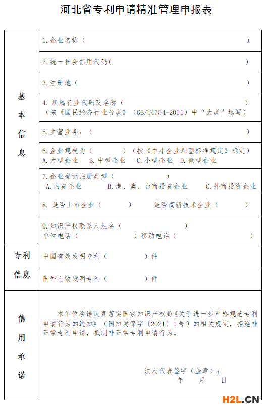 (二)市場主體自愿申報,按照要求填寫《河北省專利申請精準管理申報表》,并提供營業(yè)執(zhí)照、事業(yè)法人證書或統(tǒng)一社會信用代碼證書復印件備查。