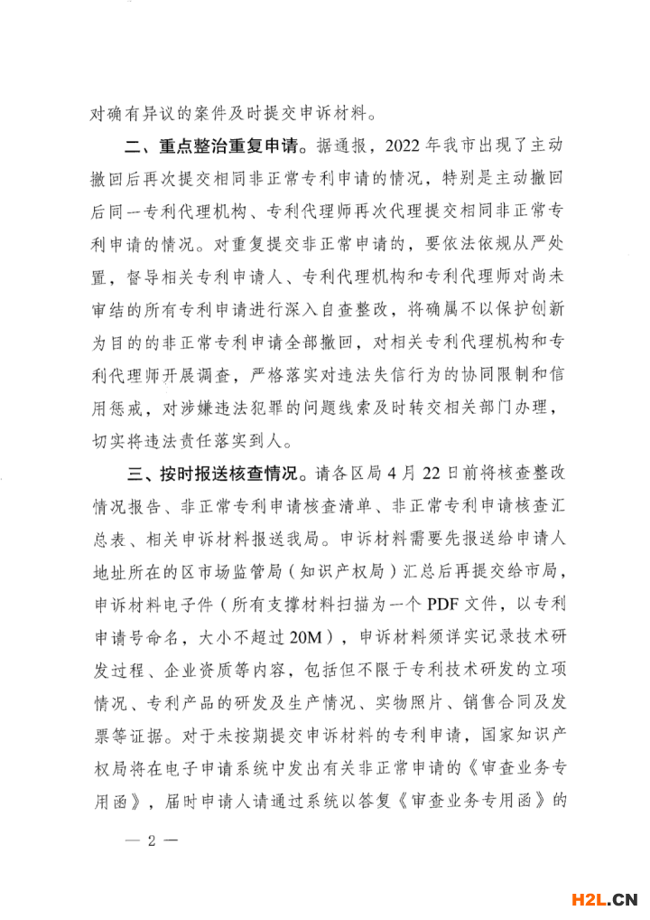 請各區(qū)局4月22日前將核查整改情況報(bào)告、非正常專利申請核查清單、非正常專利申請核查匯總表、相關(guān)申訴材料報(bào)送我局。申訴材料需要先報(bào)送給申請人地址所在的區(qū)市場監(jiān)管局(知識(shí)產(chǎn)權(quán)局)匯總后再提交給市局,申訴材料電子件(所有支撐材料掃描為一個(gè)PDF文件,以專利申請?zhí)柮?,大小不超過20M),申訴材料須詳實(shí)記錄技術(shù)研發(fā)過程、企業(yè)資質(zhì)等內(nèi)容,包括但不限于專利技術(shù)研發(fā)的立項(xiàng)情況、專利產(chǎn)品的研發(fā)及生產(chǎn)情況、實(shí)物照片、銷售合同及發(fā)票等證據(jù)。對(duì)于未按期提交申訴材料的專利申請,國家知識(shí)產(chǎn)權(quán)局將在電子申請系統(tǒng)中發(fā)出有關(guān)非正常申請的《審查業(yè)務(wù)專用函》,屆時(shí)申請人請通過系統(tǒng)以答復(fù)《審查業(yè)務(wù)專用函》的形式提交申訴材料,我局不再受理。