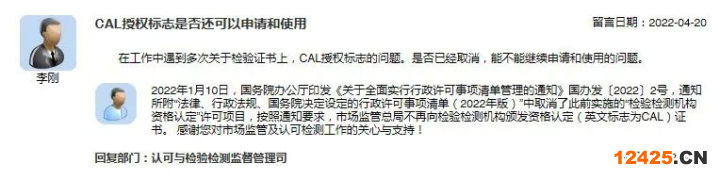 近期,有網(wǎng)友在市場監(jiān)管總局網(wǎng)站公眾留言系統(tǒng)咨詢“CAL授權(quán)標志是否還可以申請和使用”,市場監(jiān)管總局認可與檢驗檢測監(jiān)督管理司給予了答復(fù)。