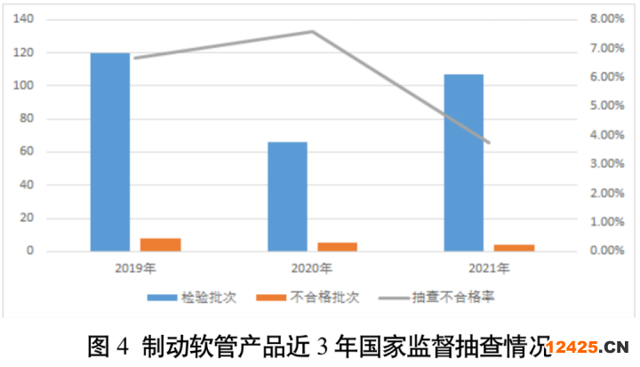 (五)制動(dòng)軟管抽查不合格率為3.7%。本次抽查了18個(gè)省(區(qū)、市)107家企業(yè)生產(chǎn)的107批次制動(dòng)軟管產(chǎn)品,發(fā)現(xiàn)4批次產(chǎn)品不合格,抽查不合格率為3.7%,較上次抽查下降了3.9個(gè)百分點(diǎn)。該產(chǎn)品近3年抽查不合格率分別為6.7%、7.6%、3.7%。