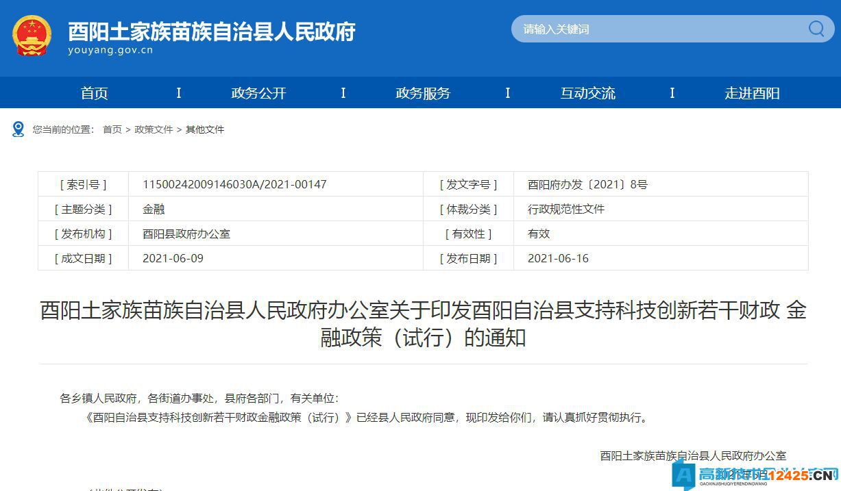 酉陽自治縣支持科技創(chuàng)新若干財政金融政策(試行)