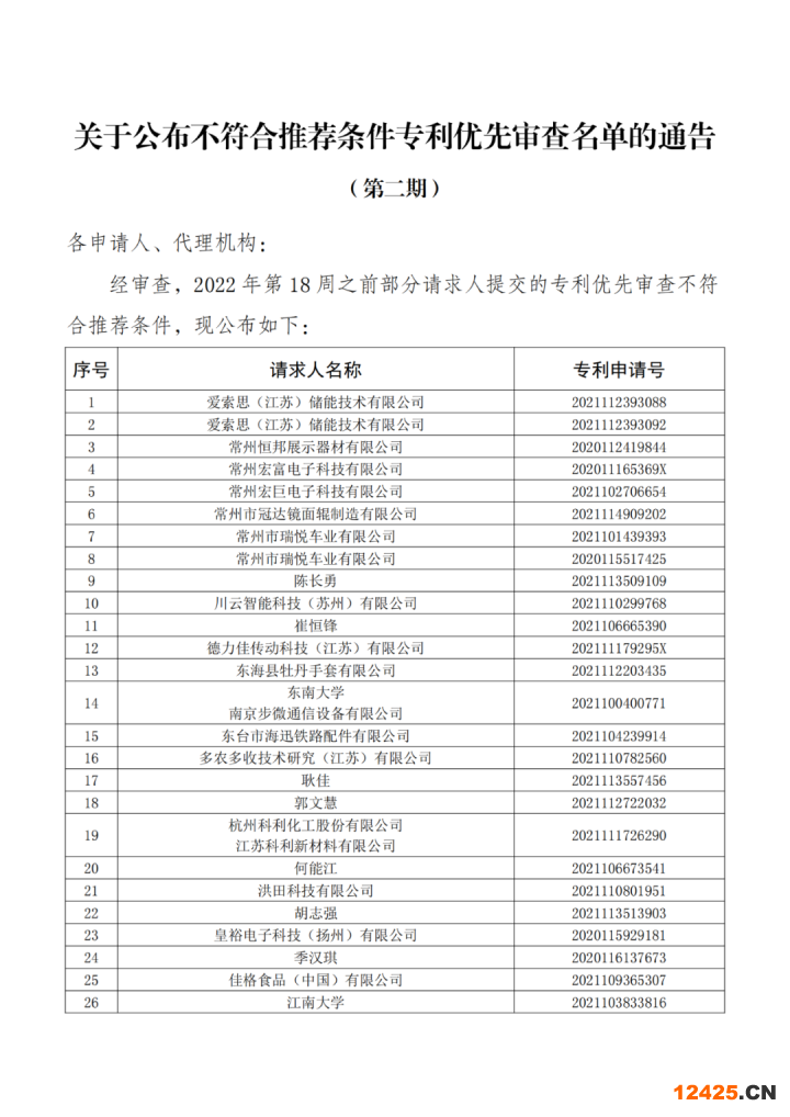 關(guān)于公布不符合推薦條件專利優(yōu)先審查名單的通告(第二期)