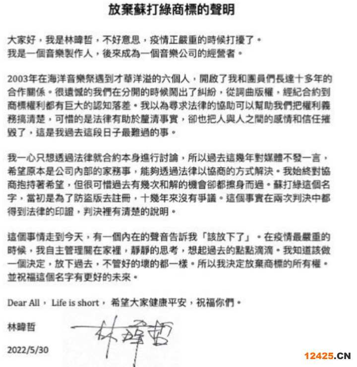 自蘇打綠樂隊(duì)與前經(jīng)紀(jì)人林暐哲鬧翻后,關(guān)于“蘇打綠”商標(biāo)的權(quán)屬問題已經(jīng)糾纏了兩年。5月30日,林暐哲突然發(fā)聲明宣布:“我決定放棄商標(biāo)的所有權(quán),并祝福這個(gè)名字有更好的未來。”