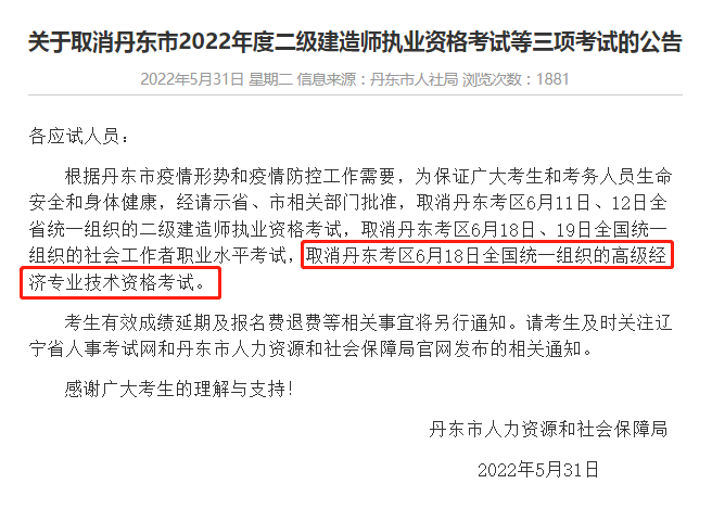 截至目前,上海市、北京市、天津市、遼寧省丹東市、河北省唐山市、河北省廊坊市6個考區(qū)發(fā)布通知取消或暫停當?shù)?月18日全國統(tǒng)一組織的高級經(jīng)濟專業(yè)技術(shù)資格考