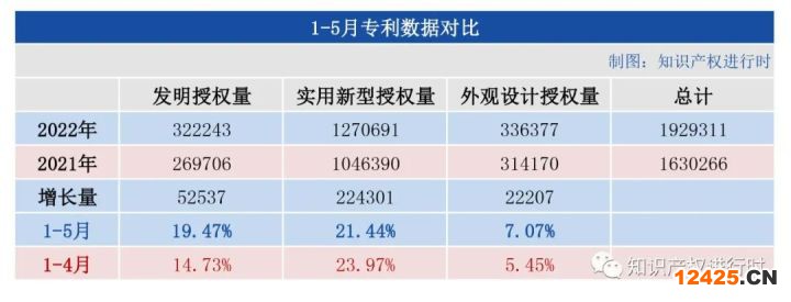 2022年1-5月知識產(chǎn)權(quán)數(shù)據(jù):發(fā)明授權(quán)量同比增長19.47%,實(shí)用新型同比增長21.44%