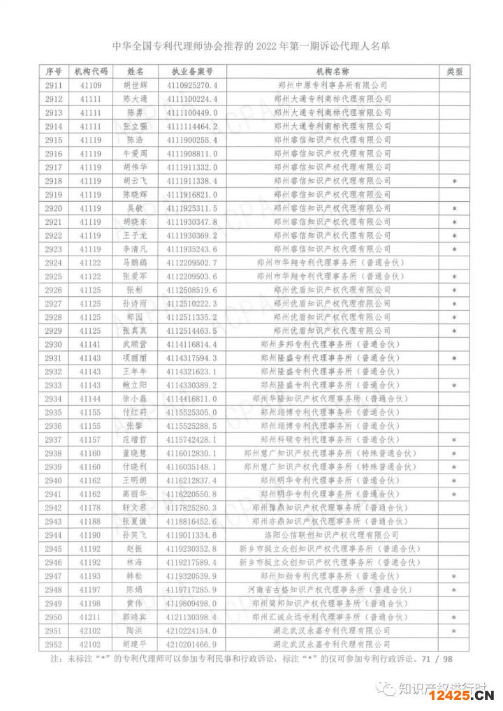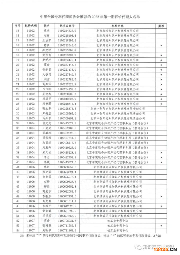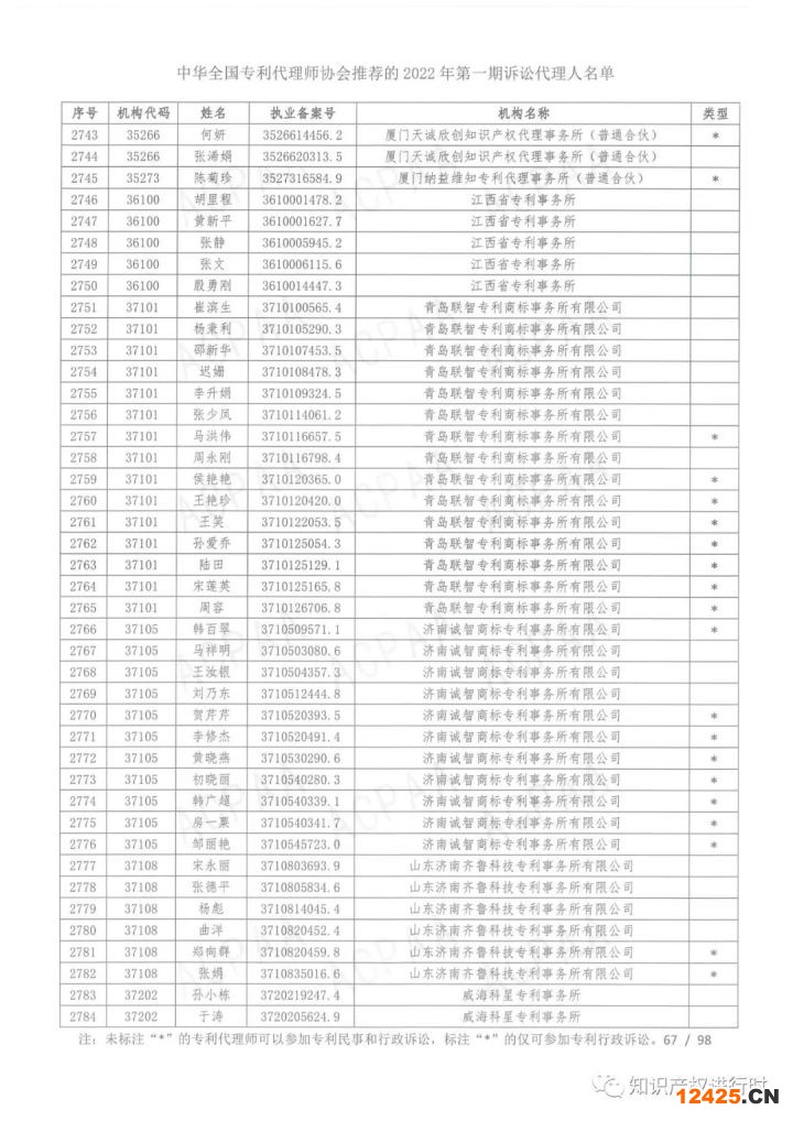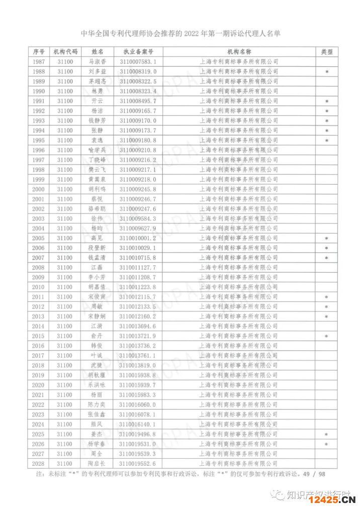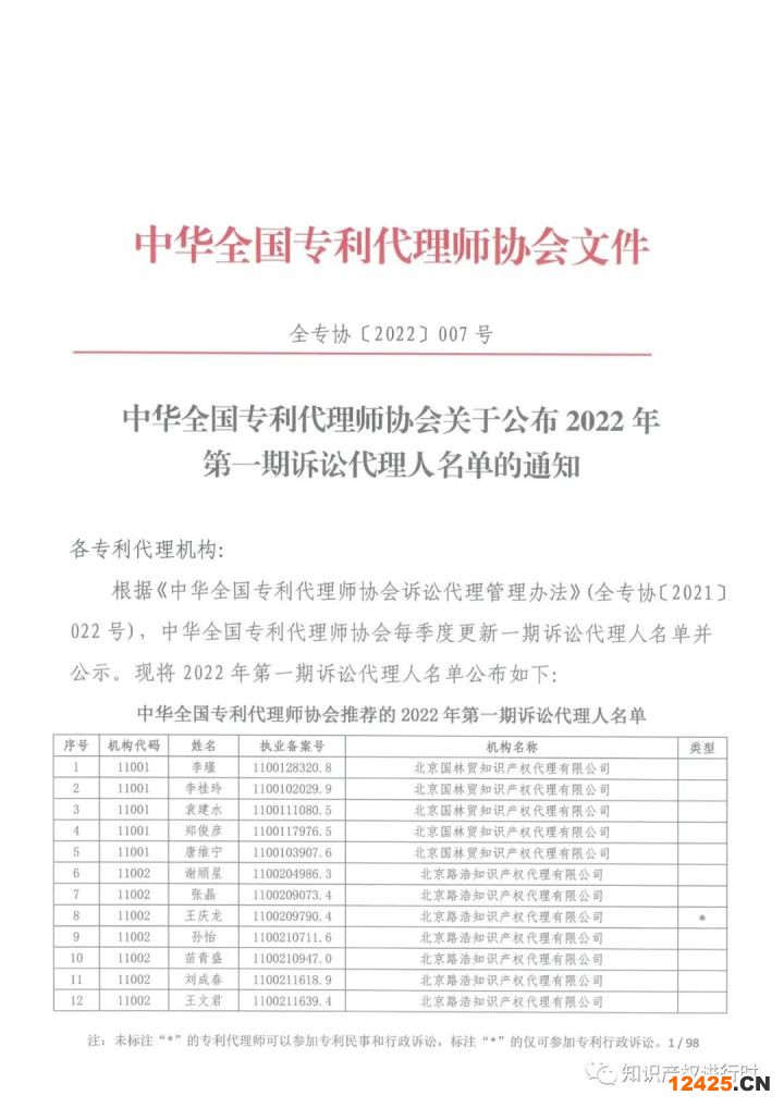 中華全國(guó)專利代理師協(xié)會(huì)關(guān)于公布2022年第一期訴訟代理人名單的通知