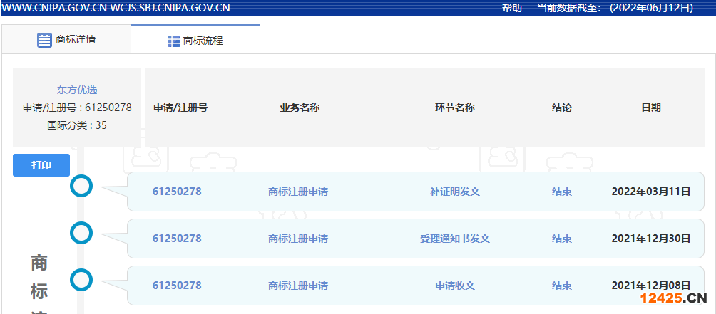 新東方公司申請的第35類“東方甄選”商標(biāo)流程示意圖-2022.3.12補正發(fā)文