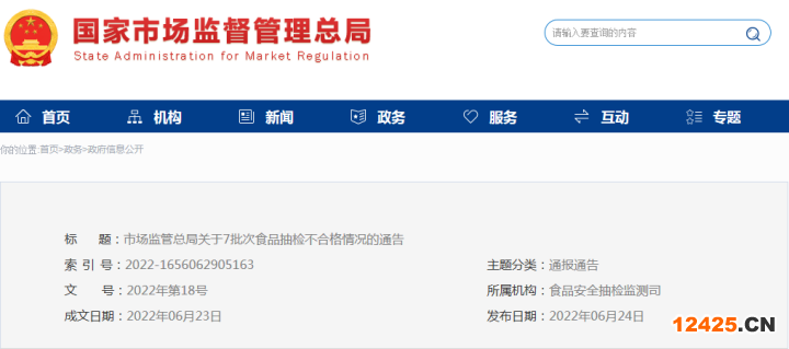 市場監(jiān)管總局關(guān)于7批次食品抽檢不合格情況的通告