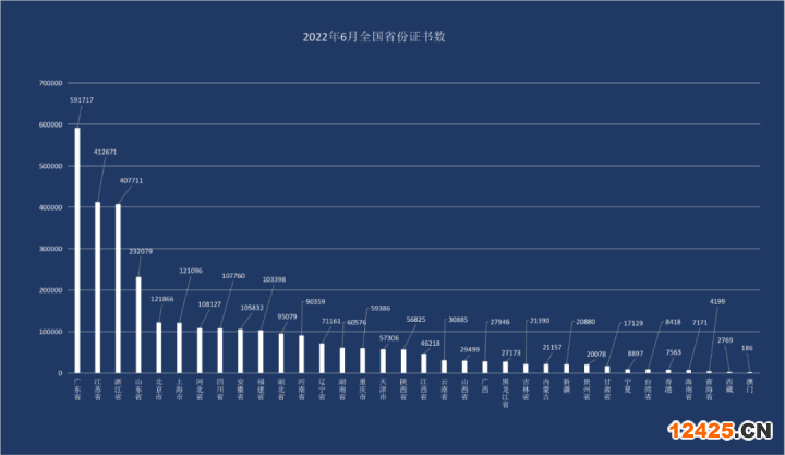 其中證書數(shù)10萬以上的省、市區(qū)有10個,分別為廣東省591717張、江蘇省412671張、浙江省407711張、山東省232079張、北京市121866張、上海市121096張、河北省108127張、四川省107760張、安徽省105832張、福建省103398張。