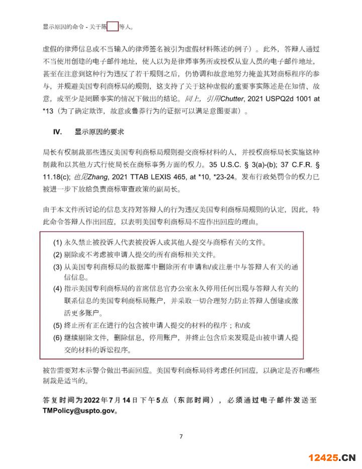 6月30日,USPTO發(fā)布制裁文件,文章中的內(nèi)容通過翻譯軟件進行翻譯,陳某和黃某用虛假律師簽名提交357份美國商標(biāo)申請