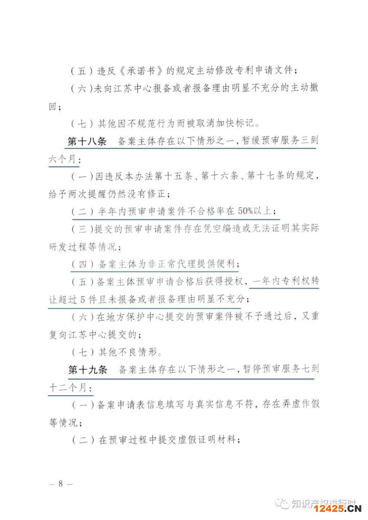 第二十條 備案主體存在以下情形之一,暫停預審服務(wù)一年以上:(一)提交非正常專利申請,并被國家知識產(chǎn)權(quán)局通報;(二)存在重復專利侵權(quán)行為,或被法院、市場監(jiān)督管理局(知識產(chǎn)權(quán)局)認定專利侵權(quán)后拒不執(zhí)行行政處理決定;(三)存在假冒專利行為,并且拒不執(zhí)行行政處罰決定;(四)其他不良情形。