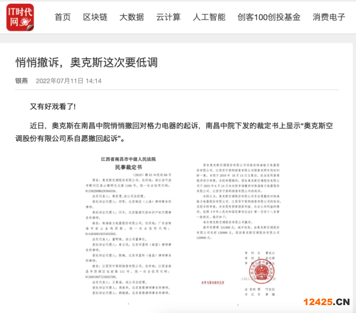文章主要內(nèi)容為“近日,奧克斯在南昌中院悄悄撤回對(duì)格力電器的起訴,南昌中院下發(fā)的裁定書上顯示‘奧克斯空調(diào)股份有限公司系自愿撤回起訴’。”