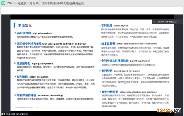 為鼓勵(lì)引導(dǎo)創(chuàng)新主體積極報(bào)名參賽,全面掌握賽事規(guī)則及有關(guān)注意事項(xiàng),提升創(chuàng)新主體高價(jià)值專利的培育與布局能力,6月9日,2022年粵港澳大灣區(qū)高價(jià)值專利培育布局大賽(下稱“灣高賽”)清遠(yuǎn)站巡講活動(dòng)通過線上直播的形式成功舉辦。
