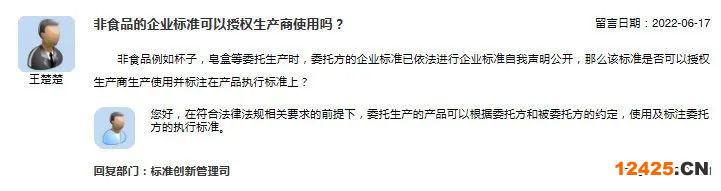 近期,有網(wǎng)友在市場(chǎng)監(jiān)管總局網(wǎng)站公眾留言系統(tǒng)咨詢“非食品的企業(yè)標(biāo)準(zhǔn)可以授權(quán)生產(chǎn)商使用嗎”,市場(chǎng)監(jiān)管總局標(biāo)準(zhǔn)創(chuàng)新管理司給予了答復(fù)。