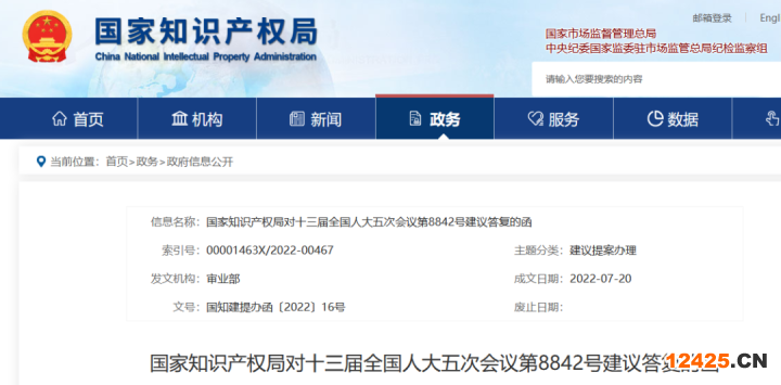國(guó)家知識(shí)產(chǎn)權(quán)局對(duì)十三屆全國(guó)人大五次會(huì)議第8842號(hào)建議答復(fù)的函。”