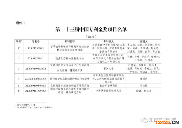 附件:1.第二十三屆中國(guó)專利金獎(jiǎng)項(xiàng)目名單