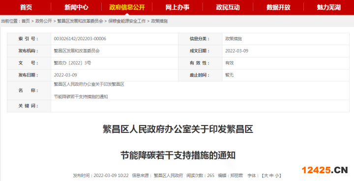 二、安徽蕪湖繁昌區(qū)出臺節(jié)能降碳若干支持措施:主動關(guān)閉高耗能企業(yè)最高可獲800萬元補助(2022年3月9日)