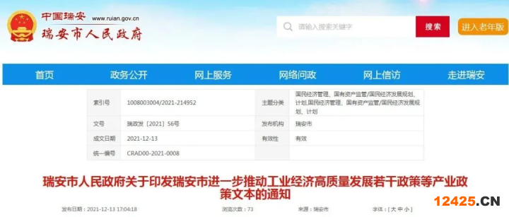 瑞安市人民政府關于印發(fā)瑞安市進一步推動工業(yè)經(jīng)濟高質量發(fā)展若干政策等產業(yè)政策文本的通知