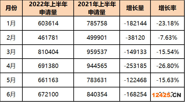 從申請?jiān)路菘矗?022年上半年新申請商標(biāo)量,與去年同期相比,各個月份新申請商標(biāo)量均為負(fù)增長。