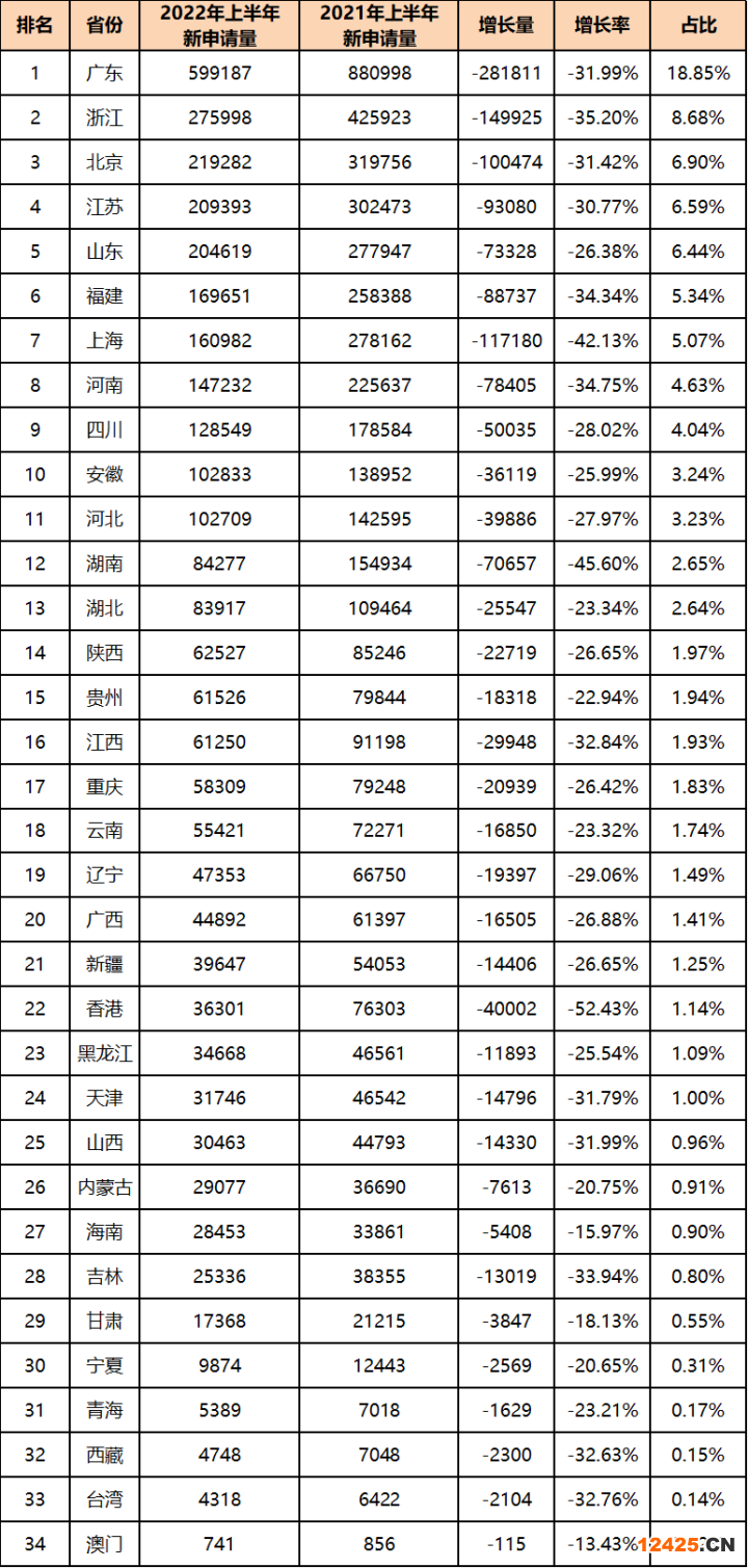 從申請人所在省份、自治區(qū)、直轄市看,2022年上半年商標(biāo)申請量排名全國前3的依次為:廣東省(599187件)、浙江省(275998件)、北京市(219282件)。