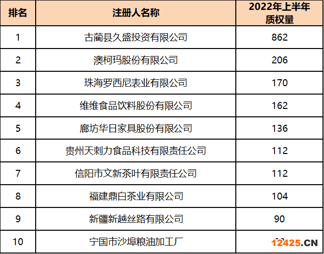 表6-2 2022年上半年商標(biāo)質(zhì)權(quán)量TOP10