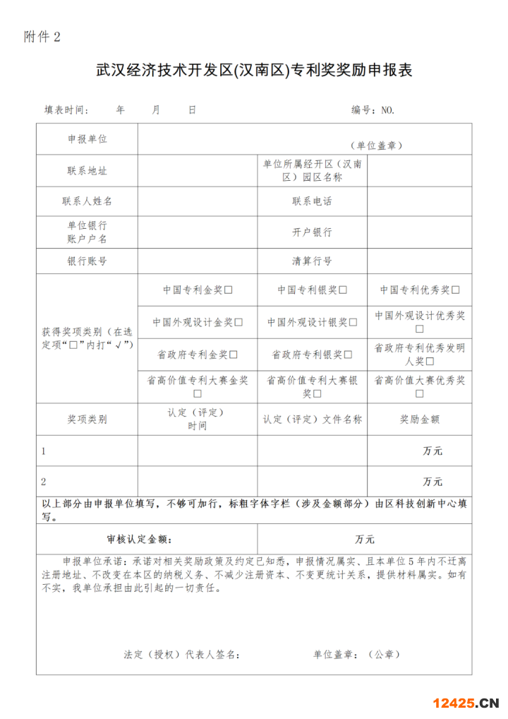(2)《武漢經(jīng)濟技術開發(fā)區(qū)(漢南區(qū))專利獎獎勵申報表》。