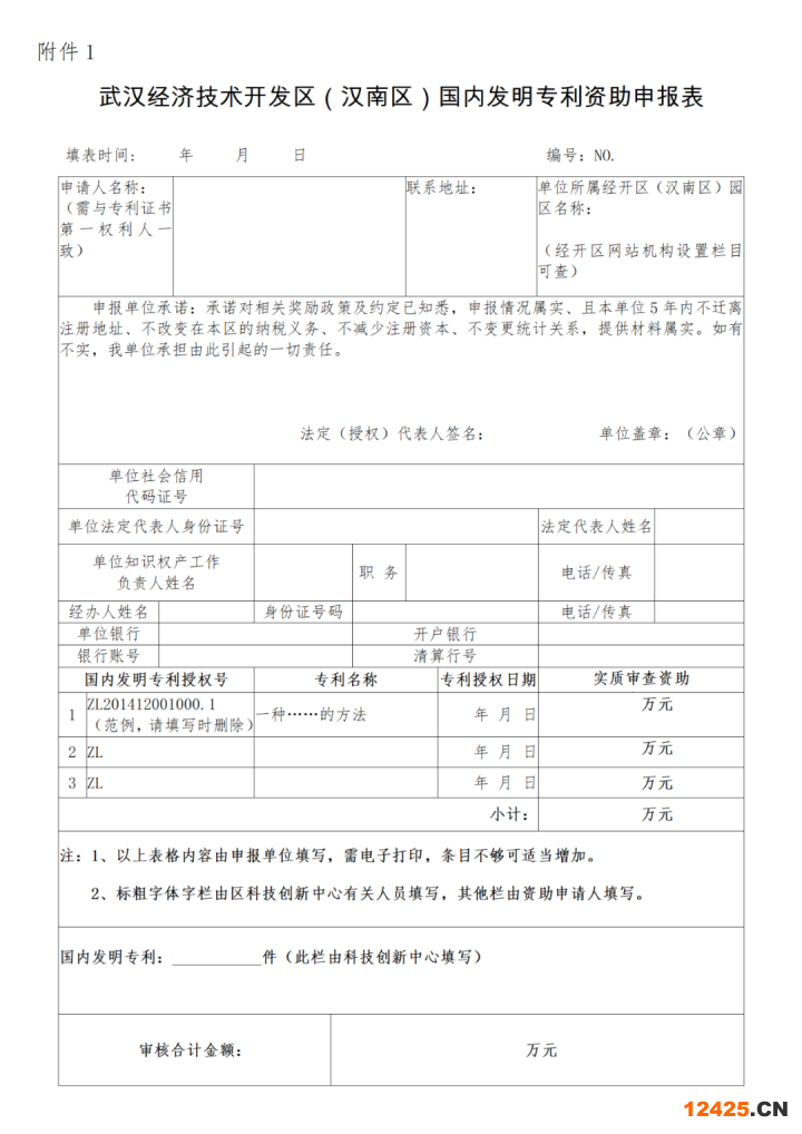 1.《武漢經(jīng)濟技術開發(fā)區(qū)(漢南區(qū))國內(nèi)發(fā)明專利資助申報表》