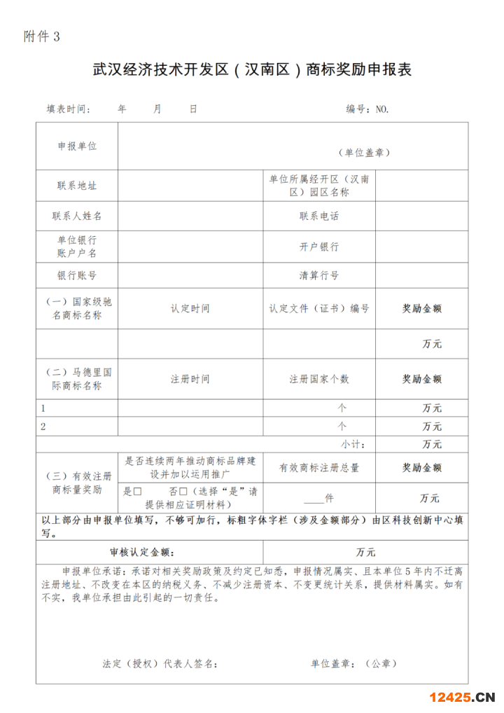 3.《武漢經(jīng)濟技術開發(fā)區(qū)(漢南區(qū))商標獎勵申報表》
