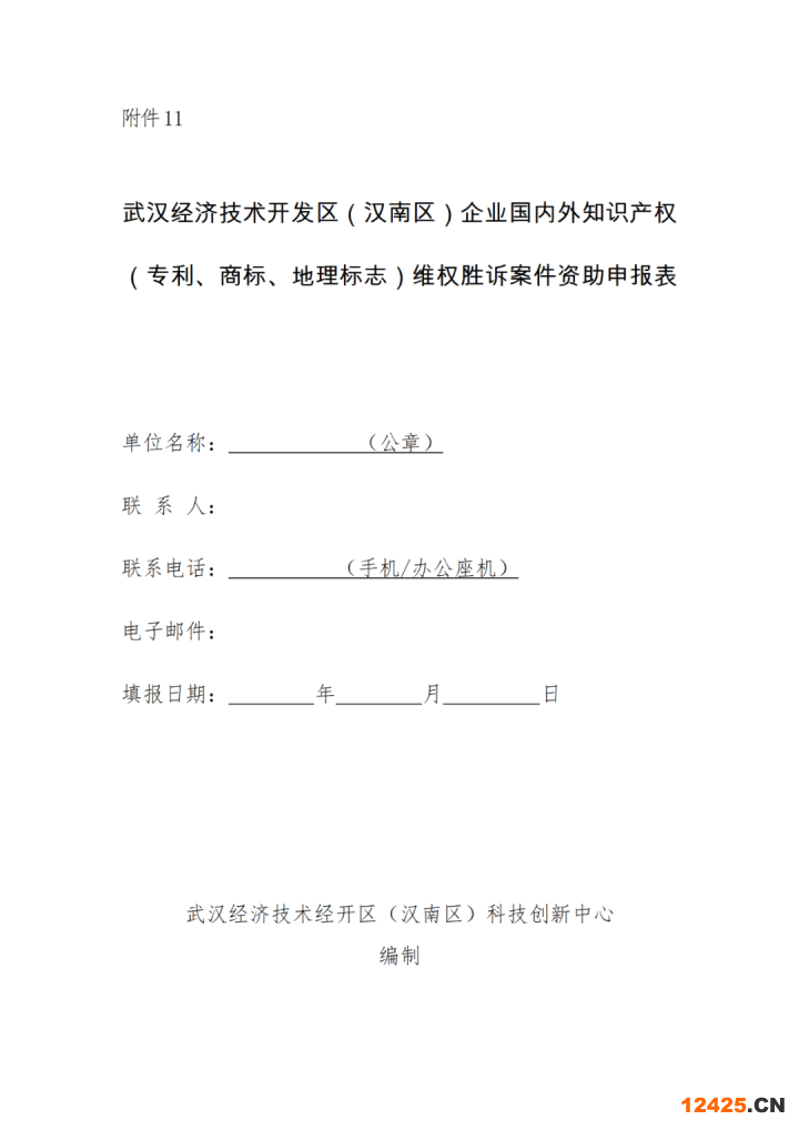 (3)《武漢經(jīng)濟技術開發(fā)區(qū)(漢南區(qū))企業(yè)國內(nèi)外知識產(chǎn)權(專利、商標、地理標志)維權勝訴案件資助申報表》。