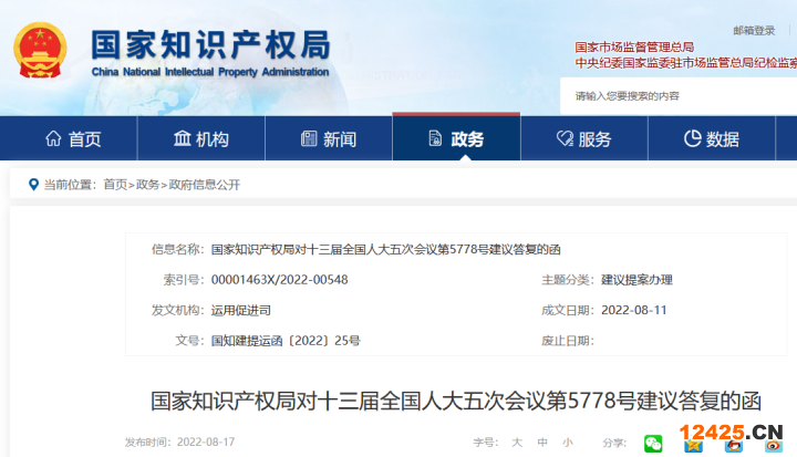 國(guó)家知識(shí)產(chǎn)權(quán)局對(duì)十三屆全國(guó)人大五次會(huì)議第5778號(hào)建議答復(fù)的函