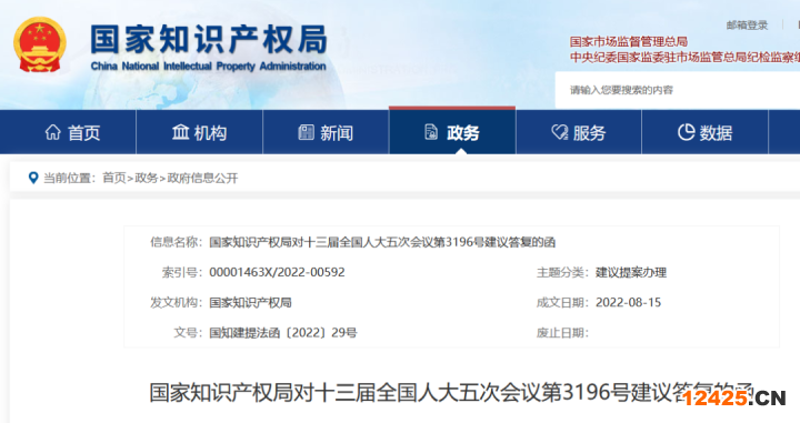 國家知識產(chǎn)權(quán)局對十三屆全國人大五次會議第3196號建議答復(fù)的函