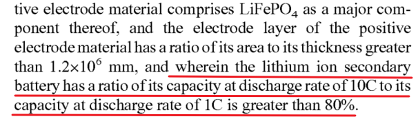 這項專利涉及的是磷酸鐵鋰電池電芯的技術,最突出的發(fā)明要點是通過對鋰電池正極材料的設計,使得電池具有了大電流放電能力。中國專利CN100502127C的權(quán)利要求1的保護范圍如下:
