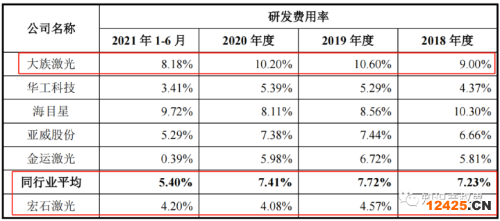 據(jù)招股書顯示,宏石激光在行業(yè)內(nèi)的主要競爭對手包括境內(nèi)的大族激光、華工科技、亞威股份、海目星等,境外的德國通快、日本Amada等。宏石激光研發(fā)費(fèi)用率與同行業(yè)公司比較情況如下: