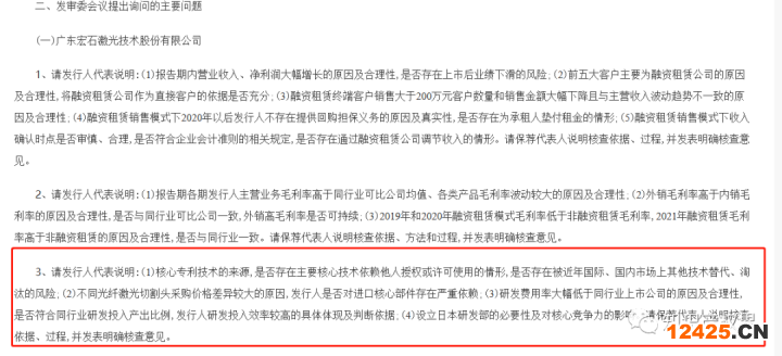 不過,事情到此還沒有結(jié)束。發(fā)審委會議針對宏石激光提出了3個(gè)問題,其中就包括“(1)核心專利技術(shù)的來源,是否存在主要核心技術(shù)依賴他人授權(quán)或許可使用的情形,是否存在被近年國際、國內(nèi)市場上其他技術(shù)替代、淘汰的風(fēng)險(xiǎn);(2)不同光纖激光切割頭采購價(jià)格差異較大的原因,發(fā)行人是否對進(jìn)口核心部件存在嚴(yán)重依賴;(3)研發(fā)費(fèi)用率大幅低于同行業(yè)上市公司的原因及合理性,是否符合同行業(yè)研發(fā)投入產(chǎn)出比例,發(fā)行人研發(fā)投入效率較高的具體體現(xiàn)及判斷依據(jù);(4)設(shè)立日本研發(fā)部的必要性及對核心競爭力的影響。”