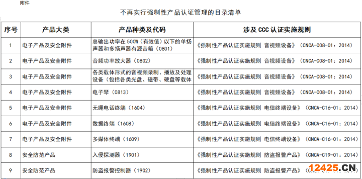 二、《強制性產(chǎn)品認(rèn)證實施規(guī)則 音視頻設(shè)備》(CNCA-C08-01:2014)和《強制性產(chǎn)品認(rèn)證實施規(guī)則 電信終端設(shè)備》(CNCA-C16-01:2014)適用范圍刪除相關(guān)產(chǎn)品;廢止《強制性產(chǎn)品認(rèn)證實施規(guī)則 防盜報警產(chǎn)品》(CNCA-C19-01:2014)。