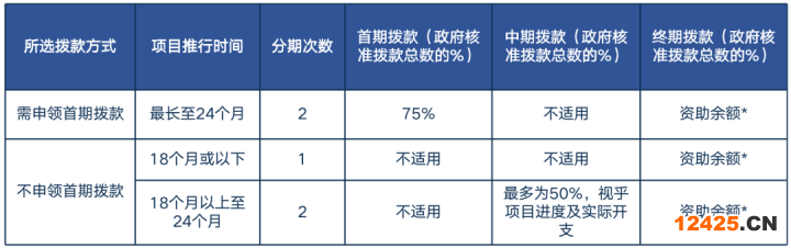 第二種:如果選擇【不申領(lǐng)首期撥款】,且項(xiàng)目推行時(shí)間在18個(gè)月或以下,那所以得政府資助金額會(huì)在項(xiàng)目終期一次性發(fā)放。