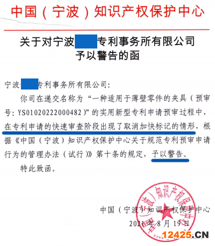 在專利申請(qǐng)的快速審查階段出現(xiàn)了取消加快標(biāo)記的情形,予以警告。