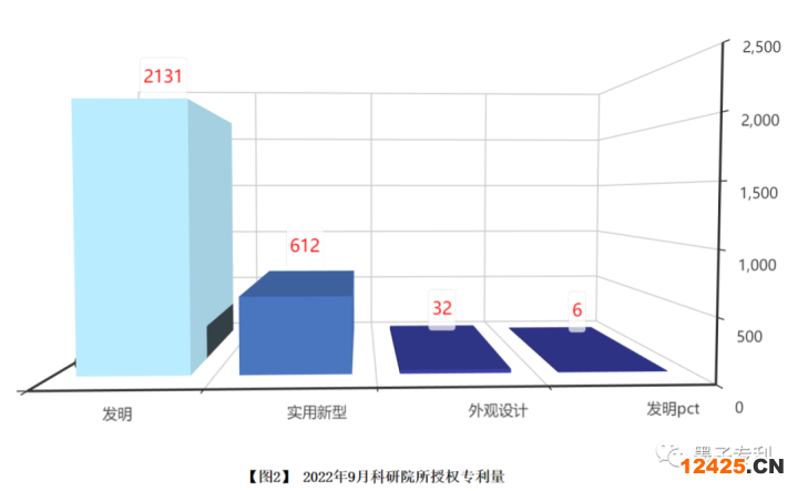 2022年9月科研院所授權(quán)專利 2781 件,如【圖2】所示,其中發(fā)明 2131 件、實用新型 612 件、外觀設(shè)計 32 件,PCT專利 6 件,發(fā)明專利占比 76.63% 。